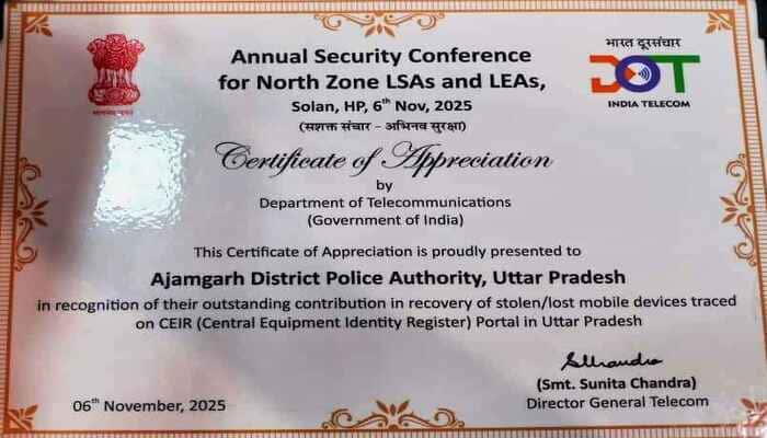 सीईआईआर पोर्टल पर सर्वश्रेष्ठ मोबाइल रिकवरी के लिए आजमगढ़ पुलिस को भारत सरकार के दूरसंचार विभाग ने सम्मानित किया। कसौली में आयोजित नॉर्थ जोन सुरक्षा सम्मेलन में डीजी टेलीकॉम सुनीता चंद्रा ने पुरस्कार प्रदान किया।