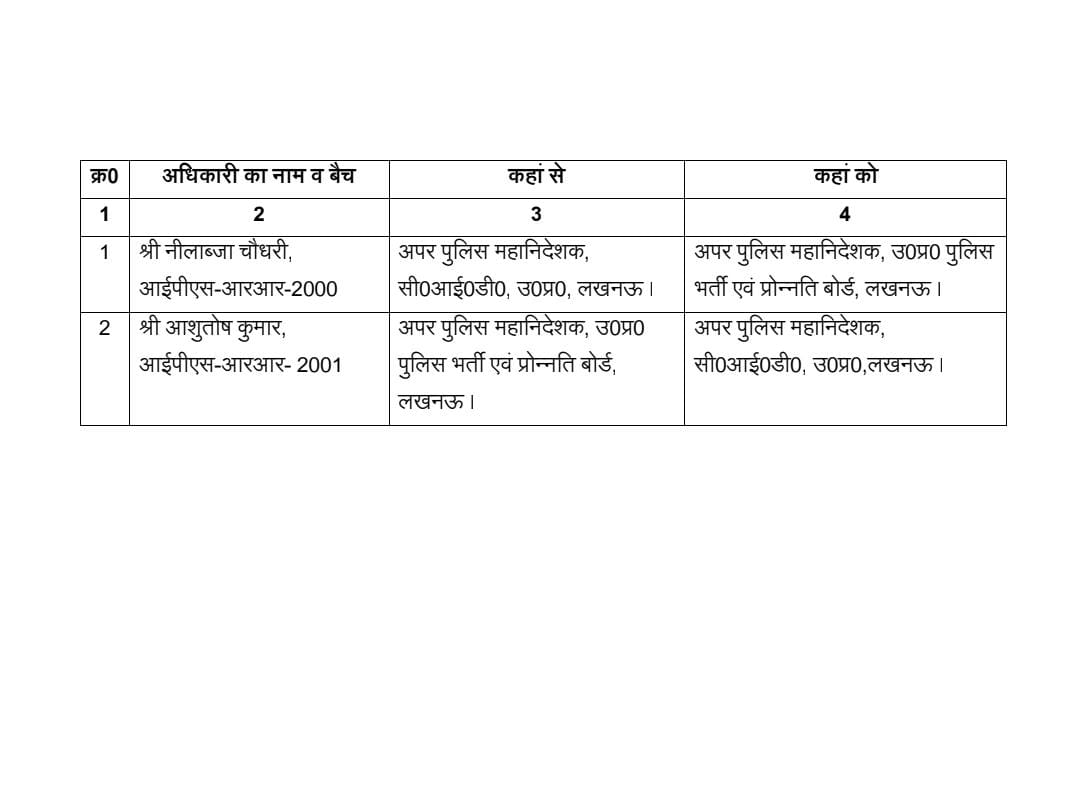 वहीं Ashutosh Kumar (आईपीएस, आरआर-2001) को अपर पुलिस महानिदेशक, उत्तर प्रदेश पुलिस भर्ती एवं प्रोन्नति बोर्ड, लखनऊ के पद से हटाकर अपर पुलिस महानिदेशक, Crime Investigation Department Uttar Pradesh, लखनऊ की जिम्मेदारी सौंपी गई है।