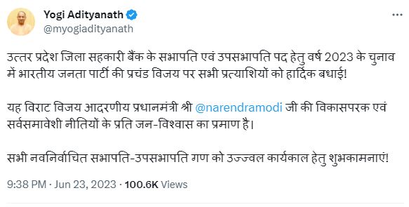 बीजेपी को जिला सहकारी बैंकों के चुनाव में मिली भारी विजय के बाद सीएम योगी ने सभी विजयी नेताओं को बधाई दी है। उन्होंने अपने ट्विटर कर रहा कि उत्तर प्रदेश जिला सहकारी बैंक के सभापति एवं उपसभापति पद हेतु वर्ष 2023 के चुनाव में भारतीय जनता पार्टी की प्रचंड विजय पर सभी प्रत्याशियों को हार्दिक बधाई। यह विराट विजय प्रधानमंत्री नरेंद्र मोदी जी की विकासपरक एवं सर्वसमावेशी नीतियों के प्रति जन-विश्वास का प्रमाण है। सभी नवनिर्वाचित सभापति-उपसभापति गण को उज्ज्वल कार्यकाल हेतु शुभकामनाएं।